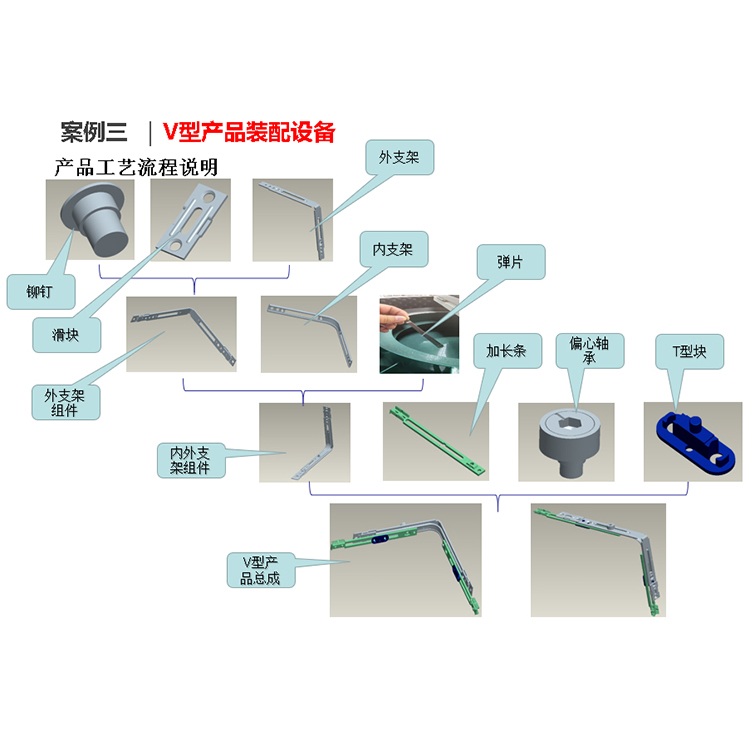 該設(shè)備自動(dòng)完成V型產(chǎn)品的裝配、旋抑、涂油及檢測(cè)。產(chǎn)品所有零件采用振動(dòng)盤或者彈夾自動(dòng)上料、設(shè)備通過有無檢測(cè)、高度檢測(cè)以及CCD檢測(cè)自動(dòng)區(qū)分良品和不良品。合格產(chǎn)品自動(dòng)輸送到成品盤。